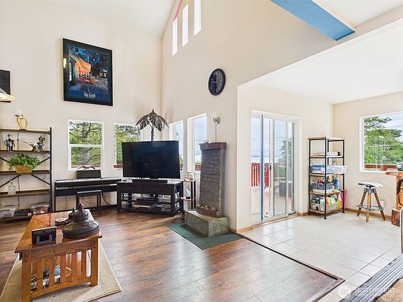 Surrounded by evergreens, this unique custom 3-level home feels like a private treehouse retreat. Spectacular Grays Harbor 180-degree views stretch from the Olympics to Mt. Rainier from the front, with Westport views from the back deck. Inside, vaulted ceilings and large windows connect you to nature. The kitchen offers granite countertops and maple cabinets. Upstairs, the primary suite includes a full bath and a flexible-view room perfect for work, hobbies, or relaxing. The ground floor has a bedroom, bonus space, kitchenette, and private entrance; ideal for guests or rental. Wrap-around deck, fenced yard, 24x28 garage/shop, 220 EV outlet, RV parking. Close to beaches, trails, and Community Club amenities. Seller offering 2% rate buydown.