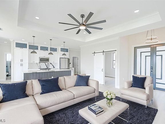 Covered lanaiWaterfall islandQuartz countertopsHigh-end finishesOpen floor planElegant modern lightingPeaceful canal views