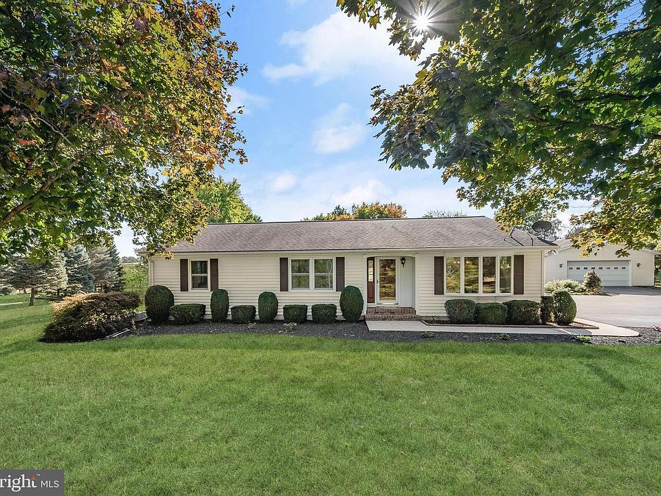 Gorgeous Rancher situated on a 2.37-acre private lot boasting panoramic views, quality updates throughout, sun-drenched windows, a neutral color palette, 30 x 50 fully insulated 6-car oversized custom garage. (See more details below) A spacious living room adorned with wood-beamed ceilings and easy access to the deck; Formal dining room embellished with a stunning bay window; Eat-in kitchen with ample cabinetry, sleek stainless steel appliances, granite countertops, decorative backsplash, and breakfast room; Primary bedroom graced with an en suite full bath and walk-in closet; Three generously sized bedrooms and a full bath complete the main level sleeping quarters; Travel downstairs to find the expansive family room, bedroom, full bath, office, bonus room, laundry room, and plenty of storage; Exterior features: Landscaped grounds, sizeable deck, 6-car oversized detached garage/ commercial grade shop fully wired to industrial code. 5- 220 Volt Outlets (4 garage, 1 in shed), 1- 50 amp, 1- 40 amp, 3- 30 amp, 30- 110 volt, 20 amp outlets, 18- 8ft LED lights, additionally includes a Shop Compressor Air System Rapid Air w/ 5 drops w/ exterior drain lines, epoxy floor w/drain, heat & A/C, water & floored attic. Provides secure storage. Pastoral views, private lot, and backs to trees; Recent updates: Kitchen, bathrooms, and more! A MUST-SEE!