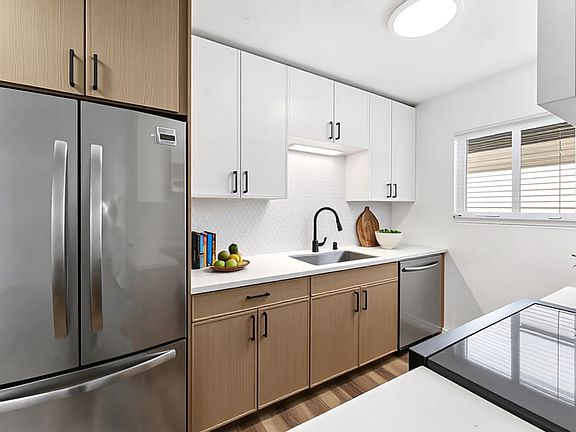 - Stunningly designed kitchens with beautiful new quartz counters, new tile backsplash and new stainless appliances, modern fixtures and lighting.