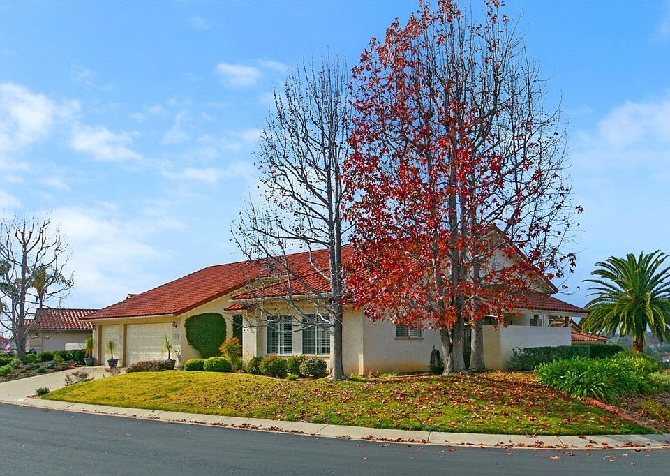 Huge price reduction! Take advantage of this East Ridge bargain! Located on a very private corner lot in East Ridge, this home has an updated kitchen with granite counters, a stone backsplash and stainless steel appliances. A dual sided fireplace brightens up both the living room and the family room. The home has an excellent floor plan with the large master suite in the south wing, common rooms in the middle, laundry and two bedrooms Three car garage is divided in a way that allows for a large workshop, if desired.Beautiful low maintenance side yard has rose bushes an avocado tree and more. East Ridge is a beautiful gated, 55+ community. Low HOA of only $267 includes common area maintenance, a club house, pool, spa, tennis and pickleball courts, bocce ball court, garden, walking trails, storage lot for your RV and more. East Ridge has it all. don't miss this great value!