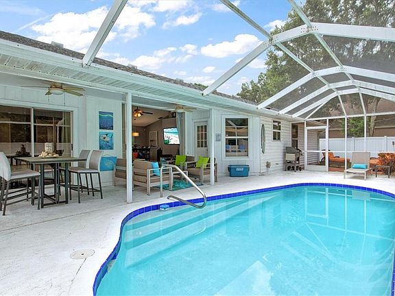 Welcome to The Castaway Cottage, your own private coastal retreat close to Downtown Sarasota and area beaches. There's room for the whole crew in this 3 bedroom 2 bathroom pool home with designer upgrades and beachy motif. Located just steps from the Ed Smith Stadium where the Orioles host their Spring Training games the house is quiet, comfortable and centrally located to all of the best Sarasota Amenities. The property is fully fenced, pet friendly and is being offered turnkey furnished. Castaway Cottage is just 1.2 Miles from Main St Sarasota! The Castaway Cottage offers the ideal floor plan for families and large (or small) groups on vacation, working remotely, or house hunting for any length of time. The space sets up as follows: The front door opens into a large living room with immediate views of the sparkling newly surfaced pebble pool. Seating in the living room is provided for up to 10 people including two swivel chairs, a three seater leather queen sleeper sofa, a retro chair with ottoman and a hightop table with 4 chairs (which doubles as the dining table). The room features a 60 inch mounted flat screen TV with access to complimentary streaming services and lightning fast internet speed. Vaulted ceilings and wall to wall sliders make the space feel light, bright and open and a pass through into the kitchen with two bar stools allows everyone to take part in the conversation. The living room also offers a dry bar with barware and boardgames. The Master bedroom occupies its own wing of the house and includes a large walk in closet, a well appointed en suite bathroom, a work station, and a 60" flat screen TV. The 2nd bedroom offers two twin beds while the third bedroom offers a queen bed with pool access via sliding glass doors. A shared bathroom is located between these two bedrooms. The kitchen is well appointed and features new quartz countertops with a lagoon blue backsplash, a work station looking out onto the pool and backyard and two bar stools overlooking the living room. Access to the pool can be had from the kitchen, the living room sliders or the 2nd bedroom sliders. The lanai offers seating for up to 10 people including a high top dining table (seating for 4), 4 club chairs, and 2 lounge chairs. The entire pool area is screened and offers a Webber 2-burner grill and a 70qt Coleman cooler which doubles as an extra seat if needed. Outside of the pool area you will find a 2nd lanai which is uncovered and offers chaise lounges for up to 3 guests. The backyard is fully fenced and features an elevated seating area with conversation Adirondack chairs and table. This area is conveniently covered by a large shade sail to block afternoon sun and can be lit up at night with LED string lights. Guests will be provided with a unique access code to utilize throughout their stay on the front door keypad. This eliminates the need for guests to keep track of keys.