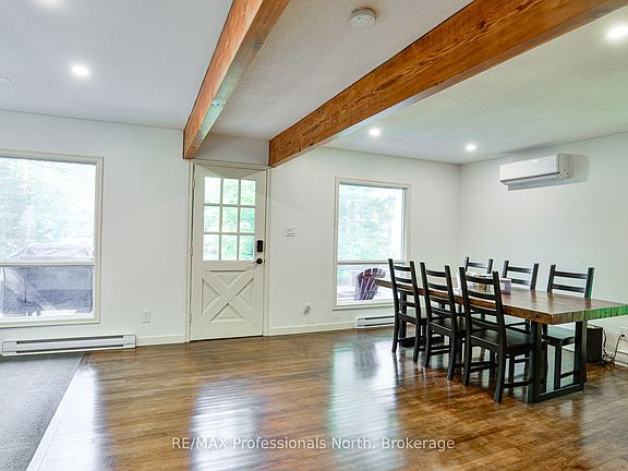 This solid 3 bedroom, 2 bath year round home or cottage has been nicely updated including new bathrooms, new kitchen (currently on order), heat pumps (which provides heat and air conditioning) and rec room. The home sits on a generously sized lot with an ideal elevation from the river which also affords great views. Enjoy lounging and meals on your front deck while watching the river flow by. Ideally situated on a quiet branch of the Muskoka River, serenity abounds, all the while only being minutes from Town. As a bonus, the area across the river is a nature reserve so there is no development. Swim, paddle and fish here!