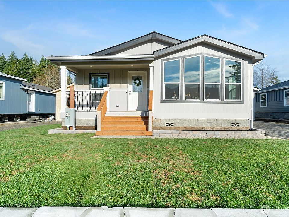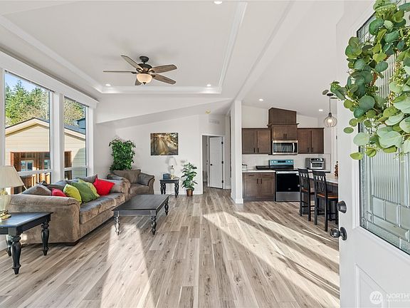 Brand new home in an established 55+ park! This one-level 2 bed plus den, 2 bath home offers modern amenities and low-maintenance living throughout. A good-sized dining area opens to a spacious kitchen with contemporary cabinetry and appliances. The living room features vaulted ceilings and expansive windows that bring in great natural light. The primary includes a full bath en suite, while the second bedroom and den offer flexibility for guests, office, or hobbies. A large laundry room adds convenience. Outside, enjoy a peaceful front porch with tranquil forest views. Space rent is ~$525/month and includes sewer; buyer pays for water, garbage, power, and cable/internet. Move-in ready and beautifully set within a quiet, established park!