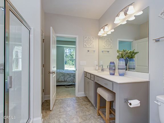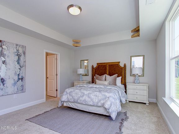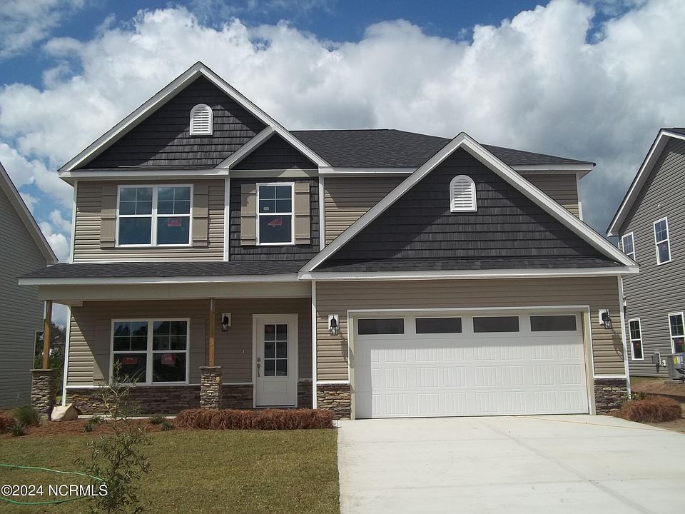 Seagrove Plan, elevation E exterior, built by Windsor Homes in the new home community, The Terraces. The Seagrove is over 3000 Sq. ft, and has a total of 5 bedrooms. Primary bedroom along with 3 other generously sized bedrooms up, along with a guest suite downstairs. Country porch out front with a 12 by 12 covered porch and 10 by 12 patio out back. LVP throughout the main living areas, tile in the wet areas, and carpet in the bedrooms. Granite counters and stainless steel appliances in the kitchen, with quartz counters in the bathrooms. The Terraces is located about 5 miles to Surf City beaches, and halfway between Wilmington and Jacksonville. It also has a community pool, lake and picnic area. Natural gas and fiber optic internet are also available.
