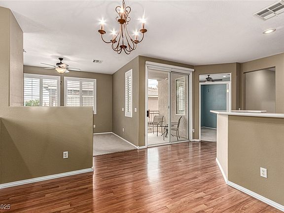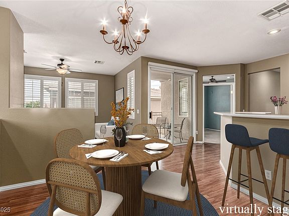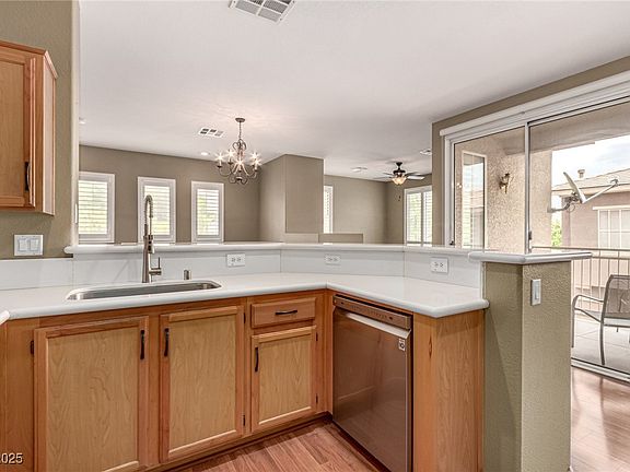 Welcome to this beautifully maintained upstairs condo in the gated Legends community near stunning Lone Mountain. Featuring 3 bedrooms, 2 bathrooms, and a 1-car garage with extra storage below, this home blends comfort with smart design. Inside, plantation shutters, wood-look flooring in the main areas, and soft carpet in the bedrooms create a warm, inviting atmosphere. The semi-open layout offers the perfect balance of connection and privacy, with a cozy fireplace anchoring the living space. You'll love the kitchen’s quartz counters, stainless steel appliances, wood cabinetry, and 2-tier peninsula with breakfast bar. Step onto the private balcony to unwind, or take full advantage of the community amenities: pool, spa, clubhouse, and fitness center. With quick highway access, nearby parks, and a peaceful neighborhood vibe, this condo is a hidden gem with real long-term appeal.