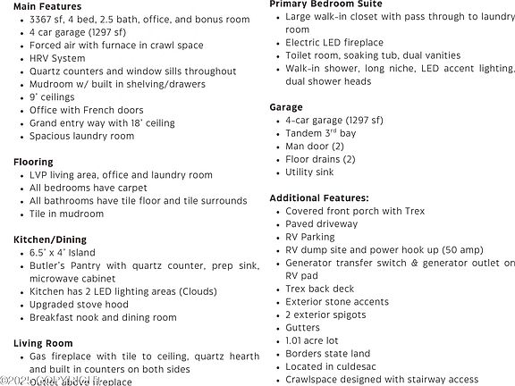 This beautifully crafted 3,367 sq. ft. home offers an exceptional blend of beauty and comfort. Featuring 4 spacious bedrooms, 2.5 bathrooms, a dedicated office, and a large bonus room, this thoughtfully designed layout is perfect for both everyday living and entertaining. Step in the grand entryway with an 18' ceiling, then into the open-concept living area where the gas fireplace is framed byfloor-to-ceiling tile, a quartz hearth, and custom built-in lower cabinets with quartz countertops on either side. The kitchen is a chef's dream with quartz countertops, a butler's pantry including a prep sink, and a large kitchen island. Enter the mudroom from the 1297 sq. ft. four-car garage, complete with a man door, utility sink and two floor drains. The luxurious primary suite features a tray ceiling, electric LED fireplace, expansive walk-in closet with direct access to the laundry room, and a spa-like bath with dual vanities, a soaking tub, and a walk-in shower with dual shower heads and LED accent lighting. Additional interior highlights include an HRV system, 9' ceiling throughout, quartz windowsills, and a generously sized laundry room. Outside, enjoy low-maintenance living with a covered Trex front porch, Trex back deck, and RV parking with an RV dump site, 50-amp power, and a generator transfer switch with outlet. Beautiful stone exterior accents, rain gutters, and a serene location at the back of a cul-de-sac with the back property bordering state land. This home is truly one of a kind. Buyer may still have time to select some finishes and/or features. Reach out to the listing licensees for an estimated completion date and construction updates. Total Builder's Package available to all Buyers prior to Closing: - As-Built Survey - DEC Septic Documentation - One Year Builder's Warranty - PUR 101 (Energy Rating) - PUR 102 (Summary of Building Inspections) - Notice of Completion Recorded