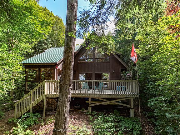 DOE LAKE: Well loved and cared for property offered by original owner. Natural state well treed lot 1.25 acres with approx 165 feet of water frontage on Doe Lake, private and peaceful. Enjoy front deck or screen room views lakeside, or relax on rear deck and share with nature. Quality built chalet style cottage with 2 upper bedrooms and 4 piece bath. Main level provides spacious open concept living area with cosy wood stove in living room for cooler nights relaxation. Bonus ... an accessible bathroom and bedroom on the main floor .Arrange your visit to the charming cottage in the woods, private waterfront , and stunning lake views all day long !! Year round access via Private Road .