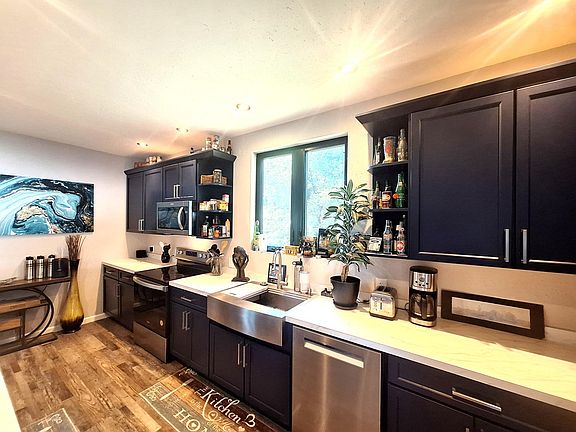The Modern Kitchen features sleek countertops, new cabinetry, with soft close doors, and modern appliances, making cooking a pleasure.