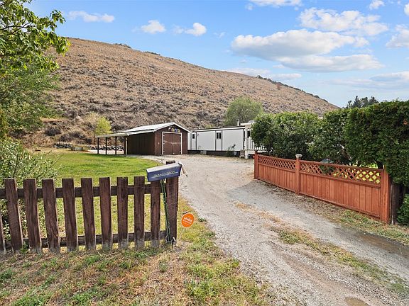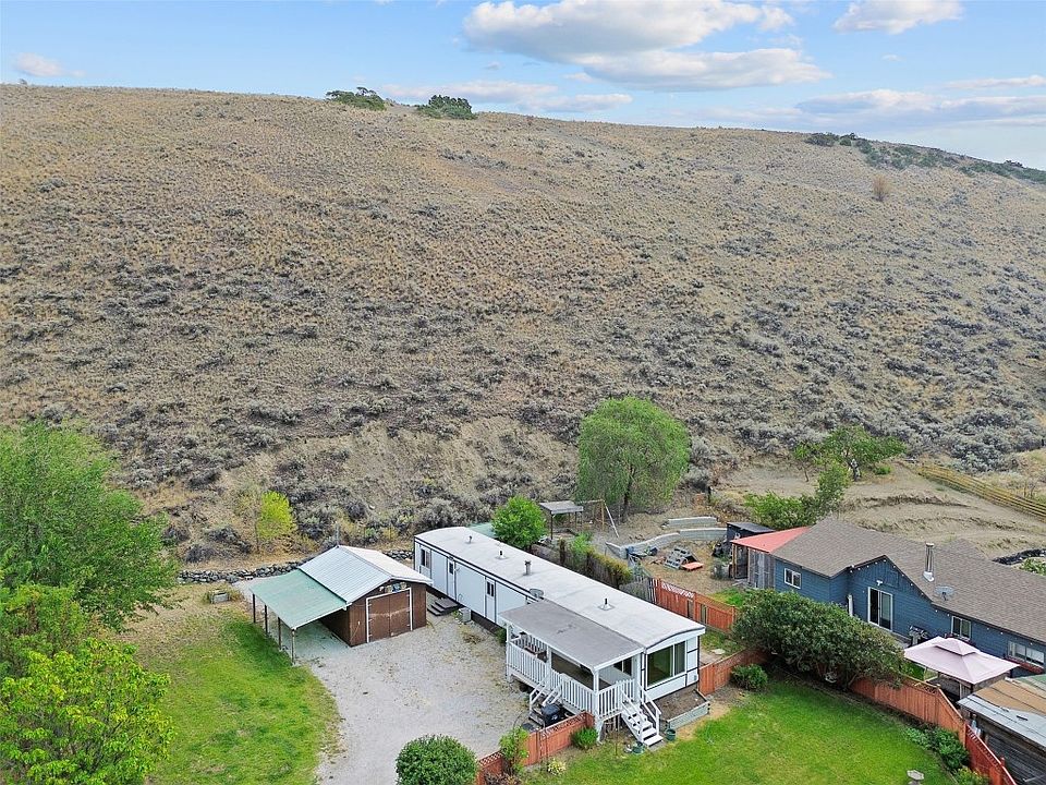 This 2 bedroom + office and 1 bathroom charming home sits on a flat 1/2 acre lot (23,702 sq ft) backing onto the hillside, boasting beautiful views, a detached garage / powered shop, and carport - all under $240,000! Featuring a large yard - perfect for gardening, a covered porch, central air-conditioning, a forced-air natural-gas furnace, a large storage shed, tons of parking, vinyl windows, a new metal roof on the shop/garage, and a fenced private yard.