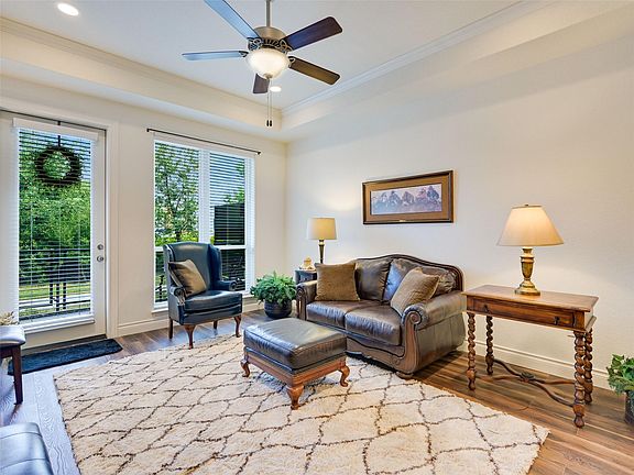 Comfortable, convenient, relaxing, luxurious and elegant but still casual define this lock and leave the sellers affectionately nicknamed "The Ritz." This rare first floor condo is nestled in the heart of Lakeway's Tuscan Village, a 55+ community. Located just inside the building's secured entrance and close to the elevator to other floors, this extraordinary unit is uniquely convenient, open, light and bright. Upon entering one is greeted with a well-designed open floor plan... beautiful kitchen with granite countertops and island, stainless appliances, significant storage, opening to living area which draws the eye to the peaceful, private fenced patio beyond... bringing the outside in. The inviting owner's suite has an abundance of natural light, a spacious bath with double vanity, walk-in shower and walk-in closet. The bonus room is perfect as TV room or guest accommodations. The location is unbeatable, close to the community library, police station, shopping, restaurants, and golf courses, as well as full-service hospital complex with broad network of medical expertise and resources. This condo has it all, including reserved parking in underground garage with personal mailbox. Community center includes large meeting/dining room, yoga studio, gym, billiards room, indoor/outdoor heated lap pool. Only a short walk to the beautiful and serene park with picnic area, pickleball court, bocce ball court, and putting green. Each of the three condo buildings has its own community space for friendship and fun gatherings. This condo is truly remarkable... a must see!