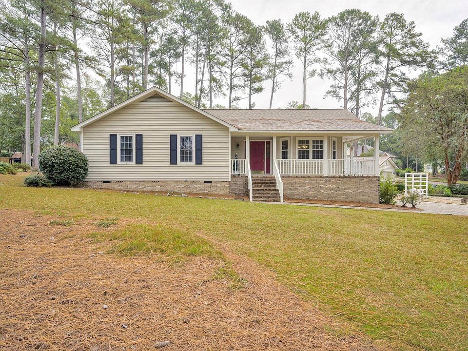 Located in the quiet community of Laurel Lakes and just minutes to Interstate you'll find this adorable low maintenance brick ranch located on the corner of 2 cul-de-sac streets. Large wrap around front porch perfect for rocking chairs! Nice open foyer leads to Dining Room with large bay window. Kitchen upgraded with new granite countertops, tile flooring, tiled backsplash, new refrigerator and stainless-steel appliances, nice double pantry with built in desk area. Great Room has true fireplace. Both bathrooms updated with walk in showers. HUGE 43 x 12 covered screened in rear patio with ceiling fans. Separate 2 car garage and a 1 car carport for additional outdoor storage. Water heater replaced 2025.