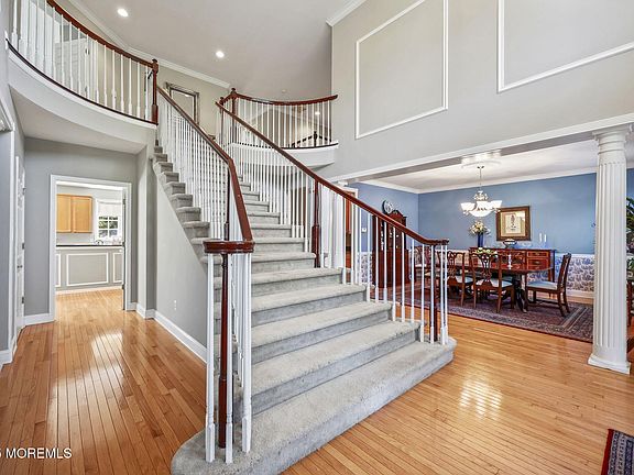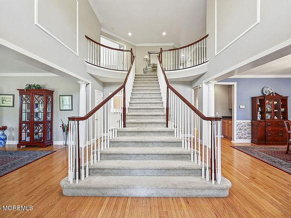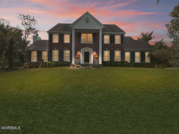 Welcome to this stately Foxborough Center Hall Colonial perfectly situated in the heart of Manalapan Township on a premium cul-de-sac location with nearly two acres of beautifully landscaped, park-like property offering space, privacy and timeless elegance. Boasting almost 4400 square feet of luxurious living space, this residence impresses from the moment you enter with its striking center staircase and symmetrical formal living and dining rooms that frame the grand foyer. The main level features a spacious sunken family room with vaulted ceiling, custom moldings, wood-burning fireplace and a seamless open flow into the expansive center island kitchen with gleaming hardwood flooring, 42'' custom wood cabinetry, stainless steel appliances and a bright breakfast area overlooking the scenic backyard. A first-floor bedroom or private office is conveniently located adjacent to a full bath, ideal for guests or work-from-home needs. The butler's pantry and secondary staircase enhance both functionality and architectural appeal, adding to the sophistication of this thoughtfully designed home. Upstairs, the grand primary suite offers a serene retreat complete with vaulted ceiling, sitting room, large walk-in closet, and an master bath with double sink vanity, whirlpool tub, dressing area and vaulted ceiling for a spa-like atmosphere. Three additional spacious bedrooms provide ample space for family and guests. The home's outdoor space is equally impressive with a multi-level Trex-style deck ideal for entertaining or quiet relaxation, surrounded by mature trees. Additional features include underground sprinklers, a partial natural gas Generac generator, two-zone HVAC, and a three-car side-entry garage with an oversized driveway for plenty of parking. This exceptional property combines comfort, and functionality in one of Manalapan's most desirable neighborhoods a true place to call home.