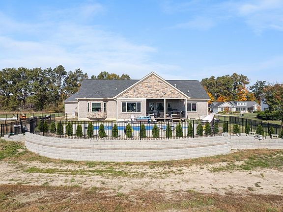 2020 model, 4812 sq. ft., almost an acre! Full brick & stone home in the highly desired,Beacon Hill Subdivision! .73 acre. 3 car garage, w/epoxy floors & 4th garage door in rear. 30x40 pole barn w/concrete/apron. Basement roughed in for a bathroom w/egress windows. Covered,front & back porch, open concept, double front entry door, w/chandelier. Granite counters & window seals throughout, walk-in pantry, large laundry room with sink & mudroom, sliding glass doors, fenced rear yard, Jack & Jill bed/bath,w/double vanity, outdoor irrigation system, Inground pool (16X36), Chef kitchen with walk-in panty, stone farmhouse sink, double oven & coffered ceiling. Floor to ceiling stone fireplace, huge primary ensuite w/jacuzzi tub, double head shower, double vanity and unique knobs throughout, security system and qualifies for USDA.