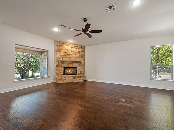 Discover the perfect fusion of single-level convenience and sophisticated luxury in this rare Lakeway find. Designed for effortless living and elegant entertaining, this stunning residence boasts a highly sought after open floorplan featuring three bedrooms, two and a half bathrooms, and a dedicated private office all in a single floor large corner lot. From the moment you step inside, with all new interior paint you are greeted by an atmosphere of refined comfort. Gleaming hardwood floors flow seamlessly through the bright and airy living spaces, illuminated by custom, designer-selected lighting. The heart of the home is the magnificent great room, anchored by a dramatic floor to ceiling stone fireplace that creates a captivating focal point for gatherings. The gourmet kitchen is a chef's dream, thoughtfully appointed with rich granite countertops, premium stainless steel appliances, and ample cabinetry. It opens directly to the dining and living areas, ensuring you're always part of the conversation. Transition effortlessly from indoor refinement to your private outdoor oasis. The spectacular covered patio offers an exceptional, shaded living space for alfresco dining, morning coffee, or simply relaxing while overlooking your serene backyard. This home isn't just a residence; it's a passport to an unbeatable lifestyle. As a resident, you'll enjoy exclusive access to a beautiful community swimming pool, tennis courts, and a basketball court. Beyond the community, you are just moments away from Lakeway Park and the Marina. Spend your weekends boating on Lake Travis, hiking the scenic trails, or enjoying the parks, all just minutes from your front door. With its rare single story design, high end finishes, and prime location, this home offers a resort style living experience every day. Do not miss this exceptional opportunity. Schedule your private showing today!