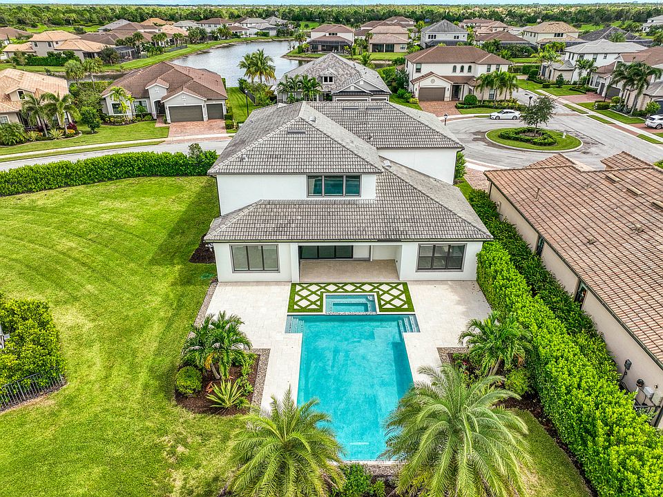 The Ultimate Sonoma Isles Retreat - Largest Corner Lot in the community! Discover luxury living at its finest with this Garden Vista model, perfectly situated on the largest corner lot in Sonoma Isles--spanning .54 acres of total privacy and lush tropical landscaping. Built in 2021, this meticulously designed home offers over 5,100 square feet of living space and a 3-car garage. With 5 bedrooms, 5.5 bathrooms, an office/flex room, loft, second flex room, PLUS a professionally designed state-of-the-art home theater, there's room for everyone to live, work, and play. Step outside to your own backyard paradise! The custom heated pool and spa--designed and built by RHR Pools--features a breathtaking flush spa surrounded by marble pavers, a stunning turf inlay, and mature palm trees. A lush green clusia privacy hedge completely encompasses the property, creating a secluded outdoor oasis perfect for relaxing or entertaining. Plenty of outdoor space for a putting green, trampoline, bocce ball courtsso many possibilities! This home provides all the essentials of easy Florida living with a whole house generator, impact glass windows, solid CBS construction & natural gas. The thoughtfully designed floorplan features the primary suite, a guest suite, office/flex room, powder room, and laundry on the main floor. Upstairs, you'll find three additional guest suites, each with en-suite baths and custom built-in closets, plus a spacious loft, second flex room, and the incredible theater room. The home theater was luxuriously designed and furnished by Krista + Home. Design features include a built-in bar area with SubZero wine refrigerator, linear fireplace, floating shelves, picture frame wall molding, blackout shades & a hidden AV equipment closet. The complete audio-visual system and furnishings are included. The theater room AV system includes: Sony 98" display, MartinLogan surround sound speakers, JL Audio Subwoofer, Marantz Audio system, Apple TV for streaming, custom LED and down lighting with Control4 smart home automation. Countless interior designer upgrades throughout include porcelain tile flooring & accent walls, upgraded wall trim, decorative ceiling planks, and stylish light fixtures & ceiling fans. The gourmet kitchen is a chef's dream with solid wood cabinetry, quartz countertops, a waterfall-edge island, KitchenAid appliances, a gas cooktop, and a large walk-in pantry. Entertain with ease in the elegant dining room featuring a glass-enclosed wine storage room. The family room boasts soaring 2-story ceilings and zero-corner impact glass sliding doors, blending indoor and outdoor living while offering tranquil views of the sparkling pool and tropical landscaping. The primary suite is a serene retreat, complete with a sitting area overlooking the pool, a custom-designed walk-in closet, and a spa-like bathroom featuring dual vanities, lighted mirrors, quartz countertops, an oversized walk-in shower, and private water closet. Sonoma Isles offers top-tier amenities including a clubhouse, fitness center, resort-style pool and spa, sports courts, and a tot lot. Located within the top-rated Jupiter school district, and just minutes to I-95, the Turnpike, pristine beaches, fine dining, shopping, and nature preserves, this home perfectly combines convenience and luxury.