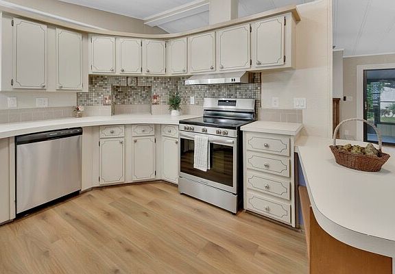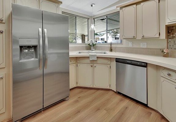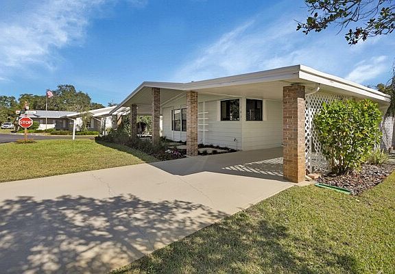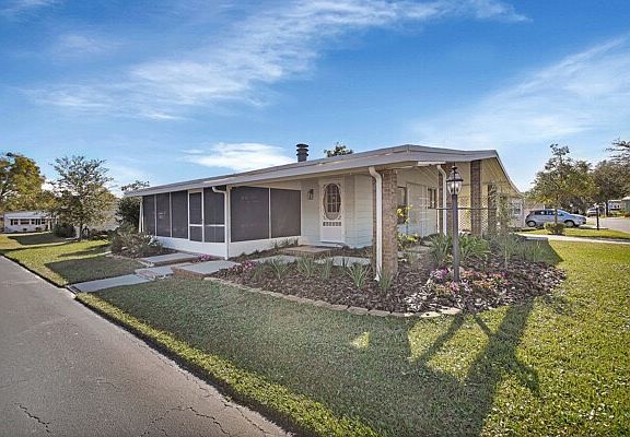 This 2 bed, 2 bath home has a great corner location at entrance to the community, across from clubhouse and pool. The roof was replaced a year ago and the flooring of the home was also a year ago. The kitchen has all new stainless steel appliances, a corner sink with a view to the street while cleaning up. The master bathroom shower has been replaced with a walk in tiled shower, and has a big walk in closet. You can step out the enclosed porch and cross the street to the clubhouse and the pool, also a perfect spot to sit and watch all the activity of the community. Driveway is deep enough to park 2 cars and still have room for a seating area to enjoy the cooler weather, and have some privacy.