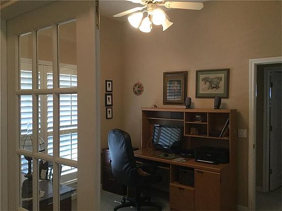 55+ subdivision, low HOA, no City taxes. 2 genuine bedrooms plus office/bedroom off front entry with French doors. Open living - dining - kitchen plan. Lots of hard tile, ceiling fans throughout, wide blinds and plantation shutters. Master has bay window, cultured marble shower stall with bench, double vanity, walk-in closet. Kitchen has island, corner sink, lots of cabinets including pantry cabinet, bay window breakfast area. Living room has nice view of back yard. Low maintenance landscaping.