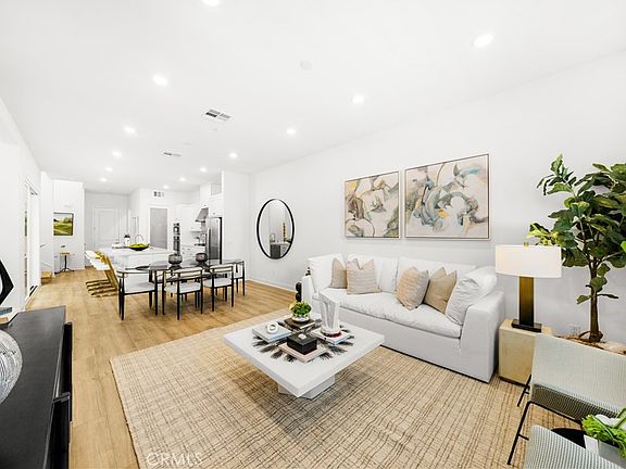 The first level features a spacious open-concept floor plan where the living and dining areas flow seamlessly together—ideal for both everyday living and entertaining. Sliding glass doors lead to a covered patio, creating a smooth transition for indoor-outdoor enjoyment.