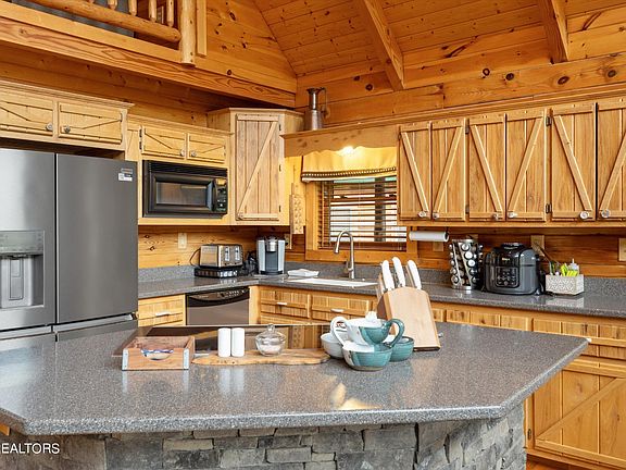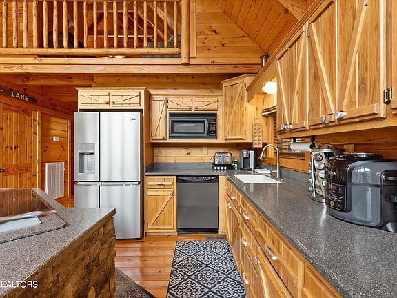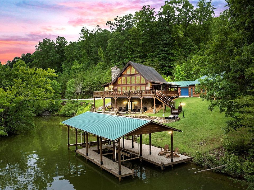 Discover the epitome of lakeside living with this exquisite log home, perfectly situated in a serene and private cove. As you approach the property, you'll be greeted by a gated entry that leads to a level driveway, designed with boat access in mind. The heart of the home is the vaulted living area, featuring a massive window wall that provides breathtaking views of the lake. This space is anchored by a floor-to-ceiling stacked stone gas log fireplace, creating a warm and inviting atmosphere. The original master bedroom is conveniently located on the main floor, offering comfort and easy accessibility. A second master suite is situated downstairs with an updated bathroom and spacious walk-in closet, providing a private sanctuary with direct walk-out access to the lake and dockage facility. This home is equipped with a state-of-the-art security system, including a remote door lock and thermostat control, providing peace of mind and convenience. Step outside to discover a wealth of amenities designed to enhance your lakeside living experience. The property includes a three-car detached garage, featuring a heated and cooled workshop with a covered porch that overlooks the lake. This versatile workshop comes with a large air compressor and pre-installed airlines. Additionally, the workshop includes a convenient half bath. For those who love boating and RV adventures, the property boasts a spacious carport with a high roof, perfect for storing boats, RVs, or motorhomes. This area is fully equipped with RV hookups, including 50 amp electric, sewer, and water, ensuring you have everything you need for your recreational vehicles. At the back of the carport, a small shop provides ample storage space for motorcycles, lawn equipment, and boat accessories. Lastly, the bass boat, two jet skis, and pontoon boat shown in the pictures are negotiable, allowing you to start your lake adventures immediately without the hassle of purchasing new equipment.