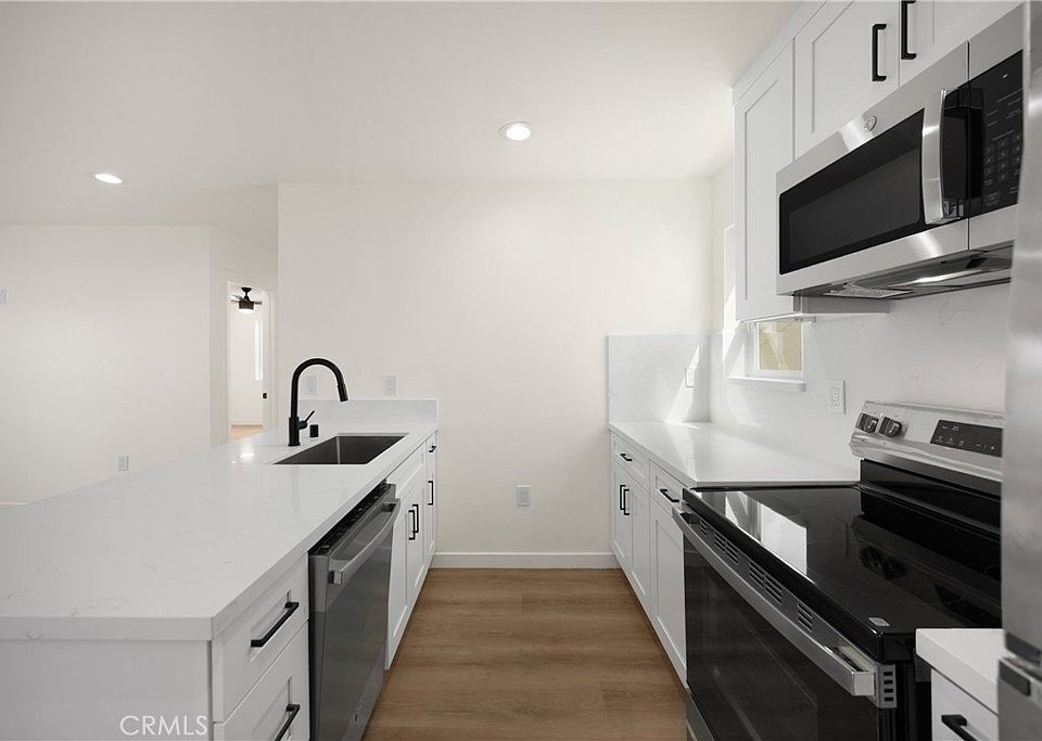 Modern kitchen with included appliances (refrigerator, stove/oven, microwave, dishwasher)