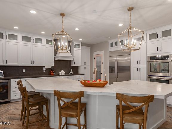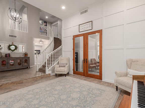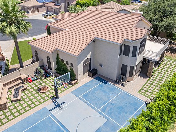 What a RARE find in Farmhouse Meadows! Situated on a cul-de-sac, this home provides 5 beds, 3 baths, a 3-car garage w/extended driveway, and a mature landscape w/synthetic lawn. Fabulous interior showcases plantation shutters, designer paint, layered crown molding, modern light fixtures, and wood-look tile flooring w/plush carpet in all the right places. You'll LOVE the formal living room w/wainscotting and an inviting family room w/fireplace & surround sound. The gourmet kitchen is a cook's delight! Boasting a combination of concrete & quartz counters, white shaker cabinetry, a walk-in pantry, and a large island w/breakfast bar. It also includes high-end SS appliances with an Elec cooktop, double wall ovens, pebble ice maker, & an under-counter refrigerator. Completing the downstairs, you have a bedroom & bathroom, plus a versatile den for an office. Head upstairs to find the well-appointed bedrooms! Double-door oversized master bedroom has a vaulted ceiling w/exposed beams, sitting area, and attached balcony. Its barn door opens to the beautifully remodeled ensuite, featuring a soaking tub, separate shower, dual sinks, built-in storage, & two walk-in closets w/mirror sliding doors. Outdoor living is a highlight, with the HUGE backyard designed for enjoyment and entertainment! The covered patio, in-ground trampoline, well-laid pavers, artificial turf, Pergola, hot tub, storage sheds, firepit w/built-in seat, and a mature tree for a refreshing shade complete the picture. Other amazing features are a brand new electrical panel, blown in insulation in the attic, permanent lights on the exterior of the home (not just for holidays!) and you are walking distance to downtown Gilbert! So much to love, come and take a look!