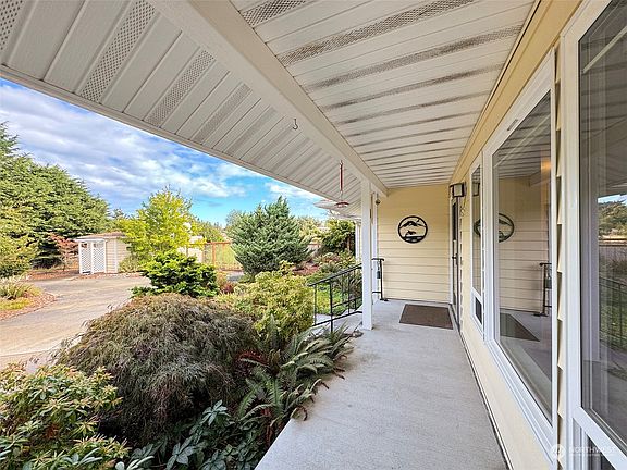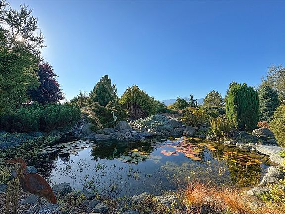 Astounding Olympic Mountain views from this exceptionally maintained one level home w/ energy saving solar panels. Immaculately landscaped yard w/fruit trees, fenced garden space, fish pond w/water fall, zen garden, large deck, finished garden shed & dual outbuildings perfect for hobbies or storage. This home has been remarkably maintained & improved: remodeled kitchen, stainless steel appliances, quartz countertops, & ample room for storage. Repurposed whiskey barrel flooring, dual sided propane fireplace between great room & primary bedroom office, wood burning fireplace in the expansive den/office w/ double french doors, huge windows to take in the mountain view, new blinds & new windows, even an oversized garage w/ electric car charger!