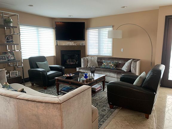 3 BEDROOMS & 3 BATHROOMS Spectacular primary bedroom with cathedral ceilings, 60" television, 2 large walk-in closets, gas fireplace between bedroom and en-suite master bath with 2-person jetted bathtub and separate shower decorated with Carrera marble. Includes toilet room, and linen closet!