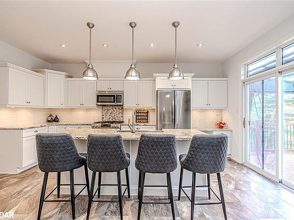 SOPHISTICATED HORSESHOE VALLEY RETREAT WITH OVER 3,750 FIN SQ FT, IN-LAW POTENTIAL, TRIPLE CAR GARAGE & PRIVATE LOT! Prestigious Horseshoe Valley living awaits in this extraordinary bungalow, steps from Horseshoe Resort and only minutes from golf courses, trails, tennis courts, and Vetta Nordic Spa. From the moment you arrive, the elegance is undeniable, with a brick exterior, updated shingles (2022), a covered porch featuring wood posts and beams, a triple-car garage with inside entry, and a driveway with parking for nine vehicles. The property itself is a private retreat, showcasing mature trees, manicured gardens, a patio with a pergola, a hot tub, a fire pit, a shed, and invisible dog fencing. Over 3,750 fin sq ft of exquisite living space is defined by hardwood floors, 14-ft ceilings, and open-concept principal rooms. The gourmet kitchen features white cabinetry topped with crown, stone countertops, an island with a sink, a bar area with a second sink and a beverage fridge, stainless steel appliances including a gas stove, and a walkout to the raised deck. A formal dining room enhances the hosting experience, while the living room is anchored by a stone-surround fireplace with a wood mantle. The primary suite is complete with a walk-in closet and a lavish 5-piece semi-ensuite presenting heated floors, dual sinks, and a glass-door walk-in shower with a bench. The impressive walkout basement continues to amaze with engineered hardwood floors, a double garden door walkout, expansive windows, pot lights, and a second kitchen with an electric induction cooktop, breakfast bar, and tile backsplash. Two additional bedrooms plus a den, a 4-piece bathroom with heated floors, and a massive recreation room create endless opportunities for family living or entertaining. The home also comes equipped with central vac. Designed for memorable gatherings, quiet moments, and everything in between, this Horseshoe Valley retreat is ready to be your forever #HomeToStay!