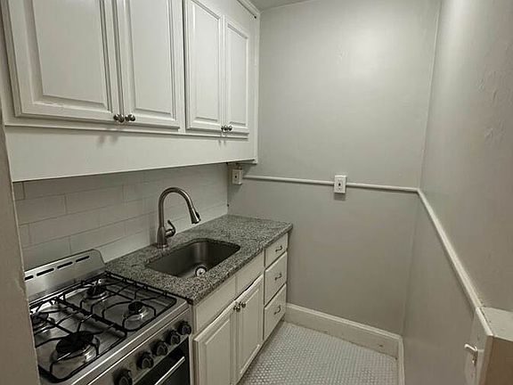 The kitchen offers granite counters, gas stove, and ample cabinet space. The bathroom is clean and modern with classic tile, a full tub, and updated fixtures.