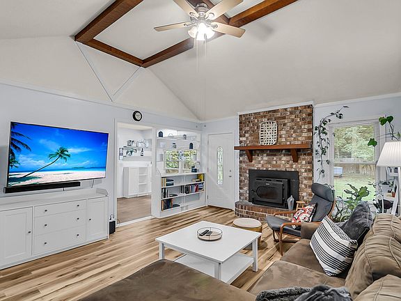 Wood burning fireplaceBrick hearthSleek kitchenLarge backyardQuiet space