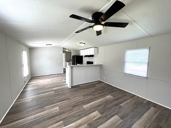 The large living room flows into an efficient kitchen complete with white cabinetry, ample counter space, and matching black appliances. A ceiling fan enhances comfort while the open layout makes the home feel even larger.