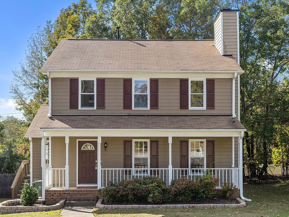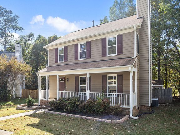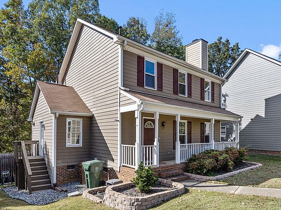 Interior Updates are Complete on this East Facing Cary Home located in a Cul-de-Sac. A Full Front Porch welcomes your guests. Refinished Hardwood Floors throughout the Entire First Floor. Family Room with Fireplace and Ceiling Fan. Formal Dining Room off the Kitchen. Kitchen features Granite Countertops, Tile Backsplash, and Stainless Steel Built-in Appliances. White Refrigerator will Convey. Adjacent Breakfast Room fills with Natural Light from the Sliding Glass Door to the Deck. Office Nook off the Side Entry Porch. New Carpet throughout the 2nd Floor. Vaulted Primary Suite with Ceiling Fan. Primary Bath with LVP, Freshly Refinished Garden Tub/Shower Combo w/ Tile Surround, Private Water Closet and Walk-in Closet. Two Additional Bedrooms up. Fresh Paint throughout the entire house. Front Load Washer and Dryer Convey. Outside features a Fenced Backyard, Paver Patio, and Wired Finished Storage Shed w/ Window A/C Unit. The lot extends beyond the fenced portion of the property providing you with over 1/3 acre.