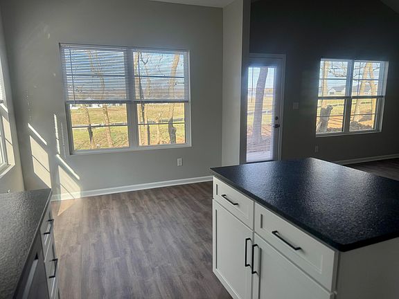 Modern accentsOpen floor conceptStainless steel appliancesSoft close cabinetsBlack leathered granite countertops