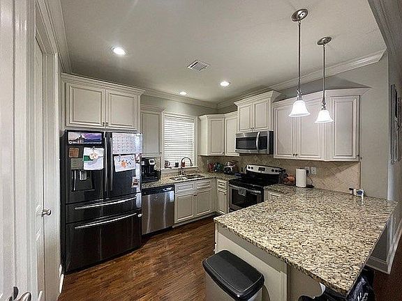 • Kitchen: granite counters, island seating, stainless appliances, pantry