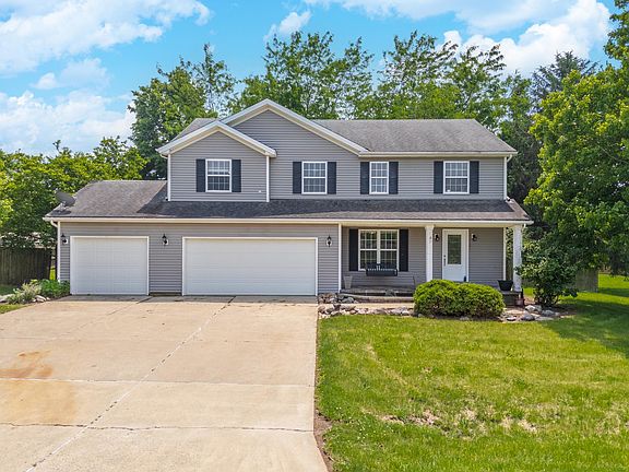 This home is located in the highly sought-after Downs Tri-Valley school district. Situated on a peaceful cul-de-sac, this spacious home features 5 bedrooms, 2.5 bathrooms, and a host of impressive amenities. As you enter the front porch, you are greeted by a grand foyer that sets the tone for the rest of the house. The main level boasts an office/dining room, a cozy family room with a gas start stone fireplace and built-ins, and a eat-in kitchen with ample cabinetry, pantry, island, and stainless steel appliances. Additionally, the main level includes a convenient laundry room and a half bath. Upstairs, the primary bedroom offers an updated attached bathroom with a huge closet and walk-in shower. Three more generous bedrooms and a full hall bathroom complete the upper level. The lower level features a family room with a bar area, a fifth bedroom, and a non-finished plumbed-in bathroom. With a 3-car garage, a huge fenced-in backyard, a massive covered deck, and space for a hot tub, this home is perfect for both relaxation and entertainment. Schedule a showing today!