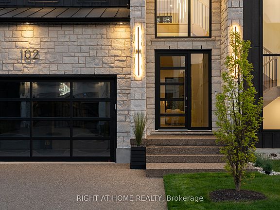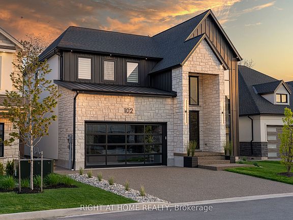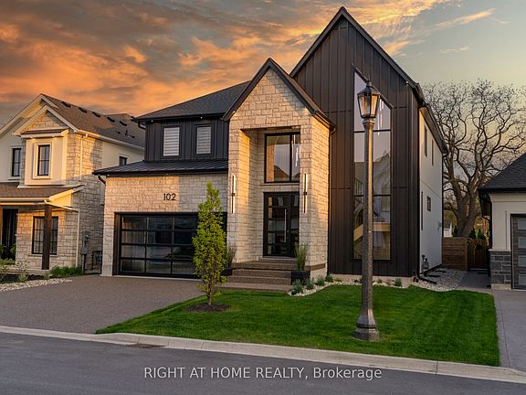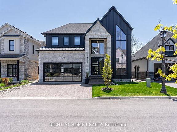 Welcome to 102 Millpond Rd, a stunning custom built home offering over 4,300 sq ft of luxurious living in the heart of prestigious St. Davids. The striking exterior blends stone, sleek glass, hardie board, stucco & a concrete driveway with exposed aggregate - all creating a clean, upscale authentic with lasting durability. Step inside to discover a modern open-tread staircase, 10-ft ceilings, wide-plank engineered hardwood flooring & European style tilt-and-turn windows. The designer kitchen is the showpiece with premium built-in appliances, a 10-ft quartz waterfall island, seamless slab backsplash, & a walk-in pantry with built-in cabinetry. An oversized sliding door opens to a large covered composite deck with spectacular vineyard views, a lower patio, in-ground irrigation & a fully fenced, professionally landscaped yard - perfect for entertaining or serene relaxation. Main floor highlights include a bright dining & living area with a chic, minimalist gas fireplace, private office enclosed by a floor-to-ceiling glass wall, a laundry room with integrated storage & convenient access to the double car garage. Upstairs, the primary suite offers a spa-like retreat with a soaker tub, oversized walk-in rainfall shower, dual vanity & a walk-through closet complete with custom shelving. Three additional bedrooms each feature their own ensuite access, providing comfort and privacy for family or guests. The fully finished basement boasts a sprawling rec room with show stopping 100-inch electric fireplace with a granite stucco surround, luxury vinyl flooring, a 5th bedroom & a stylish full bathroom. Ideally located just minutes from local coffee shops, award-winning wineries, top-rated golf courses & the charm of Old Town Niagara-on-the-Lake.