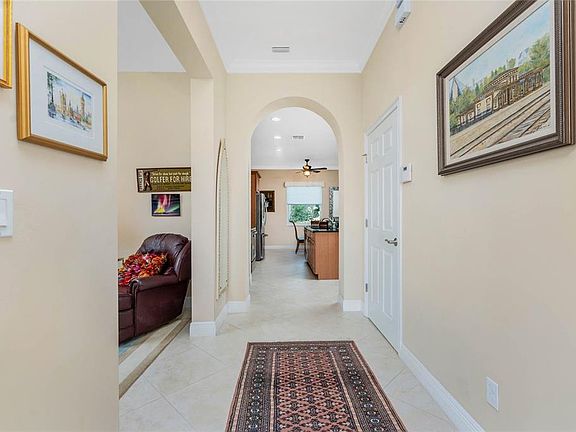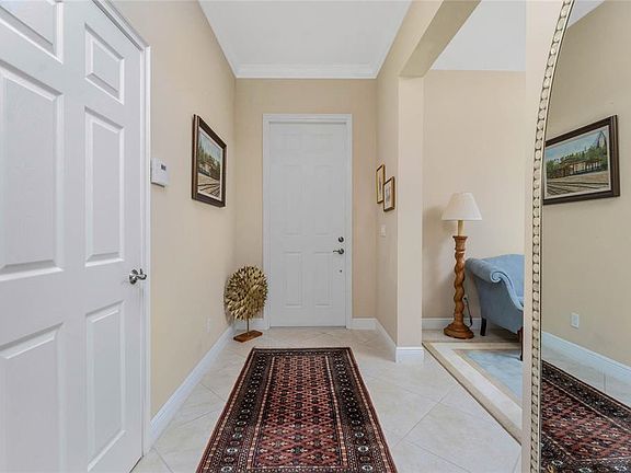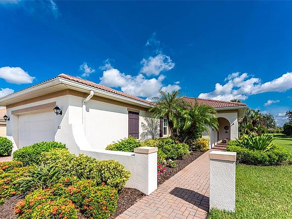 Welcome to this WCI-built Grand Villa Lesina model, a stunning property boasting 1,756 sq ft of open and airy living space, perfectly situated in a maintenance-free section of the prestigious, gated golfing community of the Venetian Golf & River Club. The home features a large great room with tray ceilings, opening to a spacious kitchen equipped with stainless steel appliances, granite countertops, a breakfast bar, and a built-in cafe-style dining area. The kitchen also includes a convenient closet pantry and tile flooring. This charming villa offers two comfortable bedrooms, including a luxurious owner's suite with tray ceilings, a full bath featuring a garden tub, a separate glass shower, dual sinks with Corian counters, a private water closet, and a walk-in closet. For additional flexibility, a bonus room with a double-door entry is located just off the kitchen, perfect for a den, study, or formal dining room. The side entry adds to the home's curb appeal with lovely landscaping. Hurricane impact windows. Inside, a spacious foyer includes an extra closet, and the two-car garage provides ample storage. Finally, a screened lanai offers a perfect spot to relax and enjoy the lovely views. This home truly blends comfort and style, making it an ideal retreat.