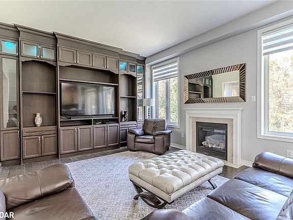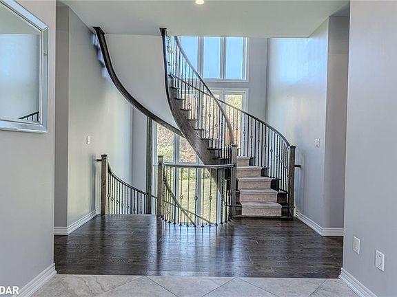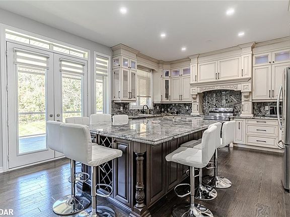 ESTATE HOME SHOWCASING OVER 5,100 SQ FT, IN-LAW POTENTIAL, LUXURIOUS FINISHES, TRIPLE GARAGE, & 2.33-ACRE LOT! Set on a prestigious 2.33-acre estate in The Shires Estates, Bradford’s most distinguished country estate community inspired by the timeless charm of the English countryside, this stately all-brick home offers over 5,100 finished square feet of refined living. The impressive exterior showcases a circular driveway, a covered front porch with double doors, soffit lighting, and a triple garage with inside entry. A 20-foot cathedral ceiling, floor-to-ceiling windows, and a grand spiral staircase create a striking first impression, while 10-ft ceilings on the main level and 9-ft ceilings on the upper and lower levels enhance the home’s scale. The custom kitchen features granite countertops, a large island, custom cabinetry topped with crown moulding, tile backsplash, stainless steel appliances, and a walkout to the deck. The main level also offers hardwood floors, a formal dining room, a living room with a gas fireplace and built-in cabinetry, two dens, and a laundry room. The generous primary bedroom showcases dual walk-in closets and a 5-piece ensuite with a soaker tub, glass-walled shower, dual vanity, and water closet, while three additional bedrooms feature private or shared ensuite access. The walkout basement provides excellent in-law capability with a kitchen boasting quartz countertops, an island, stainless steel appliances, a large rec room, two bedrooms, two full bathrooms, laundry, and a cantina. Backing onto a ravine with towering trees offering privacy, complete with a covered composite deck with glass railings, a lower-level patio, and an irrigation system. Additional highlights include a drilled well, water softener, filters, UV, reverse osmosis, HRV, high-efficiency furnace, central air conditioning, central vac, and a 200-amp electrical panel. A #HomeToStay of distinction where craftsmanship, scale, and setting exceed expectations.