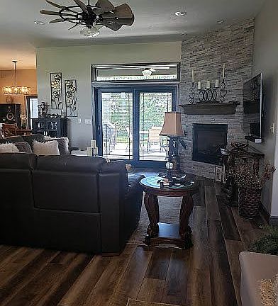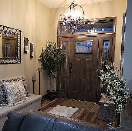 Gas stovetop, granite kitchen countertops, almost 12 foot kitchen island, tile backsplash, walk-in pantry with Costco garage pantry passage door. LVP flooring in main/carpeted bedrooms. Gas fireplace. Appliance warranty. Custom light fixtures.