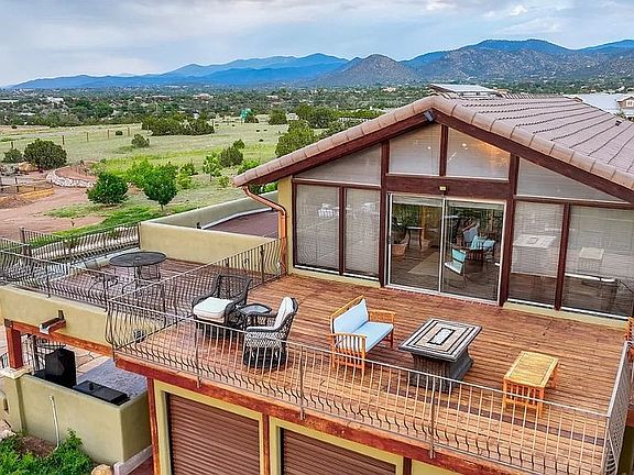 Spacious 4,500 sq ft two-story home on 2.53 acres, offering privacy and classic Santa Fe charm with amazing sunrise and sunset views. Built in 1966, this spacious residence features 3 bedrooms and 4 bathrooms, highlighted by beamed ceilings, a wet bar, sauna, and three fireplaces including a traditional kiva. The gourmet kitchen includes a gas cooktop, double ovens, and stainless appliances. Outdoor living shines with an amazing water feature, water-smart landscaping, and ample guest parking. An attached 3-car garage, structures provide convenience, while energy-efficient upgrades such as active solar heating and a tankless water heater add value.