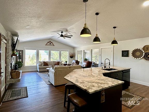 MOUNTAIN, VALLEY & PAYETTE RIVER VIEWS with over 2800 sq. ft. in the newly updated home featuring a large granite island and beautiful granite counters and backsplash that open into a great room leading you out to the deck and more views. There's a propane fireplace insert, new kitchen appliances, newly painted inside and out, new roof in 2023, and new flooring. The large windows in the living room bring in the morning light of this 3 bedroom plus a bonus room (currently used as a 4th bedroom) home. The daylight basement features a separate covered entrance, a bedroom, bath and kitchen that could easily be used as a rental if desired. Don't miss out on this large home in the city of Cascade that's on 0.34 of an acre yet close to the amenities of town with restaurants, The Strand, Payette River, Lake Cascade, golf course, public docks and boat ramp.