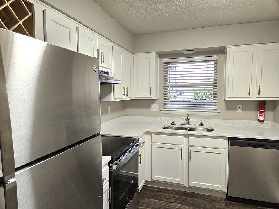 Private patioLarge walk-in closetUpdated kitchenStainless steel appliancesFresh white cabinetsQuartz countertops