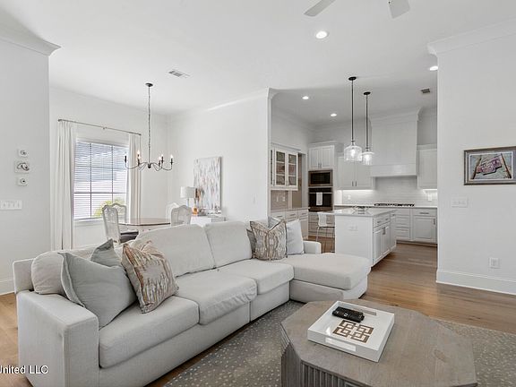 • Spacious Living Areas: High ceilings and wood floors throughout the living areas and primary bedroom. The living room is expansive, featuring a modern accent fireplace, seamlessly flowing into the formal dining room and the gourmet kitchen.
