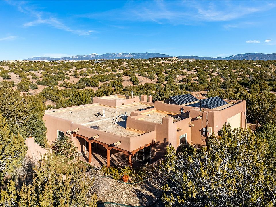 Sited within the serene landscapes of Santa Fe, this 3-bedroom 3 bath home offers a blend of comfort, style, and sustainability. This 2.5-acre property, surrounded by the natural beauty of Tres Arroyos, is within easy access to the vibrant energy of Santa Fe Plaza, allowing you to enjoy both tranquility and the lively culture of the city. The open living and dining area features exquisite Saltillo tile floors, wood beams, and a cozy wood-burning fireplace, creating a warm and inviting atmosphere. The kitchen is equipped with a center island and breakfast bar, double sink, and ample storage space. Retreat to the primary bedroom, which features beautiful wood floors, a kiva fireplace, direct access to the back portal and ensuite bath. A standout feature of this property is the small, attached studio, complete with a propane gas fireplace. This space can serve as an art studio, or home office, providing flexibility to suit your needs. The exterior of the home features two outdoor fireplaces and a pizza oven—perfect for hosting gatherings under the stars. Embrace eco-friendly living with green features that include solar panels, an instant hot water heater, and a drip irrigation system. Two-car garage. Easy access to NM-599, Santa Fe Regional Airport, restaurants, shopping, and medical.
