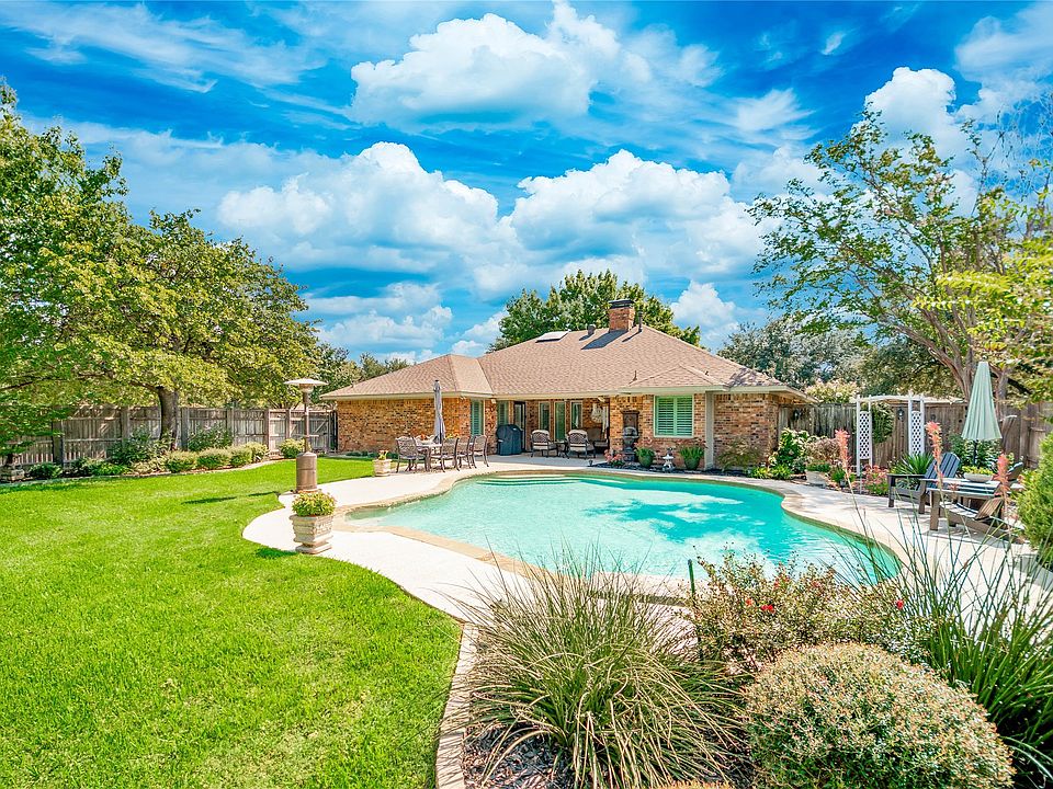 Welcome to 102 Sleepy Hollow in charming Highland Village, a warm and welcoming one-story home set on a spacious corner lot just minutes from I-35 and Lake Lewisville. Inside, natural light pours through updated windows onto fresh wood floors, new tile in the bathrooms, and plush new carpet in the bedrooms, all complemented by plantation shutters and freshly refinished kitchen and bathroom cabinets. The kitchen features modern appliances including a Viking microwave, while the bathrooms feel crisp and refreshed with clean finishes and a frameless raindrop shower door. Peace of mind comes built in with a new electrical panel featuring AFCI protection, whole-house surge protection, a fully replaced HVAC system with updated ductwork and a whole-home filtration upgrade, a newer roof, new hot water heater, freshly painted garage, and lots of added attic storage for seasonal items and extra belongings. The real showstopper, however, is the backyard an expansive, grassy retreat with gorgeous landscaping, stone borders, an arbor, a sparkling in-ground pool, a recoated pool deck, resurfaced PebbleTec interior, and upgraded pumps and lighting, all anchored by a covered patio perfect for outdoor dining, relaxing, and entertaining. Smart-home touches including a Rachio sprinkler controller, Nest cameras, and Ring doorbell add everyday convenience. Beautifully maintained and thoughtfully updated throughout, this home offers comfort, style, and the ultimate indoor-outdoor lifestyle in one of Highland Village’s most beloved neighborhoods.