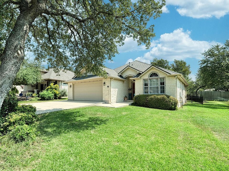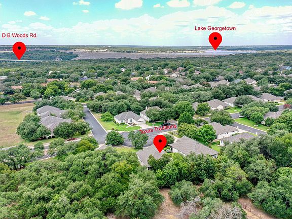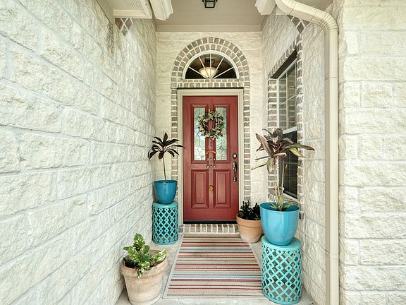 This home has one of the biggest, most beautiful yards in the neighborhood at over 8000 sq ft. The stunning white rock exterior is a delightful invitation to walk into this beautifully updated and decorated home in the highly desirable over 55 community, Texas Traditions! On a quiet cul-de-sac, Centrally located within 5 mi of literally everything including HEB, Randalls, Sprouts, Restaurants, shops, the works! Stone tile countertops and floor plus dramatic tile backsplash in beautiful, bright kitchen with breakfast nook plus formal dining area. Pretty Utility room off hall with cabinets and closet. Primary bedroom has clerestory window to add extra brightness. Updated fans, lights, and all fixtures. Bonus room could be small 3rd bedroom. Striking picture window with arched window above in breakfast area. 18in floor tile. Lots of niches and attractive ceiling treatments. Can lighting in living areas. Covered patio in back leads to a large yard privacy and wrought iron fenced.