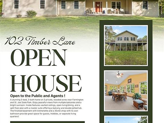 Tucked at the end of a quiet cul-de-sac, this spacious 5-bedroom, 3-bathroom home offers a rare blend of privacy, nature, and convenience. Sitting on 5 acres just minutes from downtown Farmington and steps from St. Joe State Park, you'll feel a world away in this serene, woodsy setting. Bask in the stunning sunroom or step out onto one of the balconies overlooking the forest! Inside, there's room for everyone with generous living space, vaulted ceilings, and an open dining/living room. A divided floor plan separates the 2 upstairs bedrooms from the master suite, which features a walk-in closet, walk-out balcony and a double jetted tub! With 2 bedrooms, a full bathroom, family room, kitchenette, and storage, the basement is easily transformable into separate living quarters! Outside, there is an attached 2-car garage, as well as a 30x42 shop with its own bathroom, providing endless possibilities - a workshop, guest suite, or hobby space. A true retreat with all the comforts of home! Additional Rooms: Sun Room