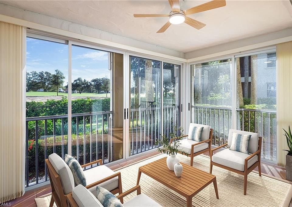 Lush views of Vineyards Country Club golf course are the backdrop to this easy living condo in Tuscany in The Vineyards. The large screened lanai is enclosed with sliding glass doors, providing the ideal spot for enjoying beautiful views and perfect weather. Offering sunny eastern exposure, this condominium enjoys lovely natural light, and comfortable split floor plan is ideal for hosting guests. Features include luxury vinyl plank flooring in the bedrooms, plantation shutters throughout, easy clean marble-tile bath floors, crown molding and a large, fabulous primary closet with custom built-ins. Tuscany is a smooth-running, active condominium association with professional management. The community offers a community pool and clubhouse, reserved covered parking and plenty of guest parking. Crossroads Market Center is a short walk or bike ride away, offering grocery, pharmacy, fitness, restaurants and more. Optional membership in Vineyards Country Club offers social, sports or golf membership, and includes a fantastic fitness center and spa, two championship golf courses, tennis, pickleball, dining and special member events. Just a quick drive from Mercato, Waterside Shops and white sandy beaches of Southwest Florida, The Vineyards offers a central location to all Naples has to offer. Whether you’re looking to purchase your first Florida home or are hoping to generate rental income, this is a spectacular opportunity to own an easy-living Naples condominium with a fantastic view!
