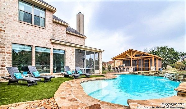 Your very own Hill Country Resort! Majestically situated high on the hill, this custom built beauty has it all ! This Hill Country home rests on over an acre of land at the end of the cul-de-sac for serenity. Wonderfully appointed, this home has something for everyone! As you enter the foyer, there is a large office to the left through French doors and plenty of light. A guest suite awaits overnight company to the right of the entrance, or it can be used as a second office. Make your way to the large family room area with plenty of windows to allow for ample natural light and breathtaking views of your pool and the hill-side behind the home. The dining room flows off the kitchen with an incredible stone fireplace! The kitchen provides custom cabinets, stainless appliances- to include double refrigerators, beautiful granite counters and even a pot filler! The primary bedroom rests at the rear of the house, split off for a little peace and quiet. This over-sized bedroom provides outside access to your pool & deck, a sitting area and a little ambiance with special lighting. Relax and unwind in spa -like bathroom- complete with a Kohler jetted spa tub! The upstairs provides another large living area / game room/ exercise room! Off of this room is a finished out inside storage room that can also be used as a "gaming room"! There are two additional bedrooms and a full bath up. NOW - for your Hill Country Resort Outdoor living area - The Showcase of the property! There's a covered patio off the dining room from the house that leads to the pool area. Relax on the pool deck sunning and drinking a cold beverage on those Hot Texas Days! There is a newly built 30x20 Cabana to entertain all year round! BBQ for your friends under the covered cabana while watching the game - complete with wet bar, two fridges and granite bar top to seat plenty. The screened in portion of the cabana has a full size fire place with sitting area to relax on those chilly nights...AND.... a dining table area for outside picnics without all the bugs! The garage is completed with epoxy flooring and includes a potassium water softener. Lantana Ridge is minutes from shopping, restaurants and medical. No City taxes and wonderful schools.